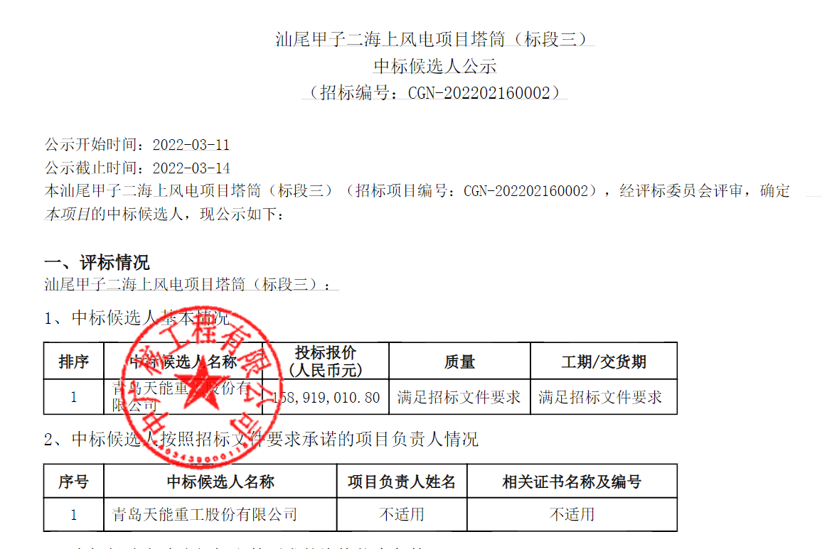 (中广核汕尾甲子二海上风电项目塔筒标段三中标公示)