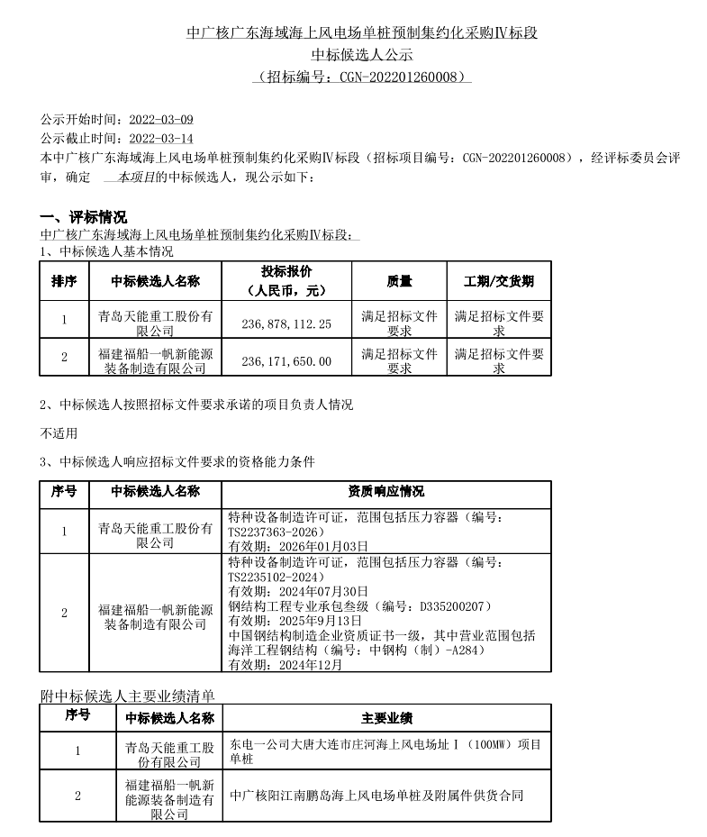 (中广核广东海域海上风电场单桩预制集约化采购IV标段中标公示)